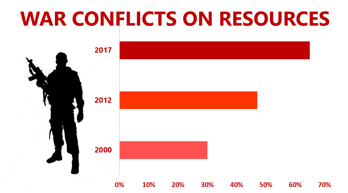 This is indeed one of the devastating manifestations of this development is the exploding number of war conflicts on resource and the control of resources: While at the beginning of the millennium “only” 30% of the war conflicts worldwide could be directly connected to the war on resources, in 2012 the were already 47%, in 2017 – 65%. [2]